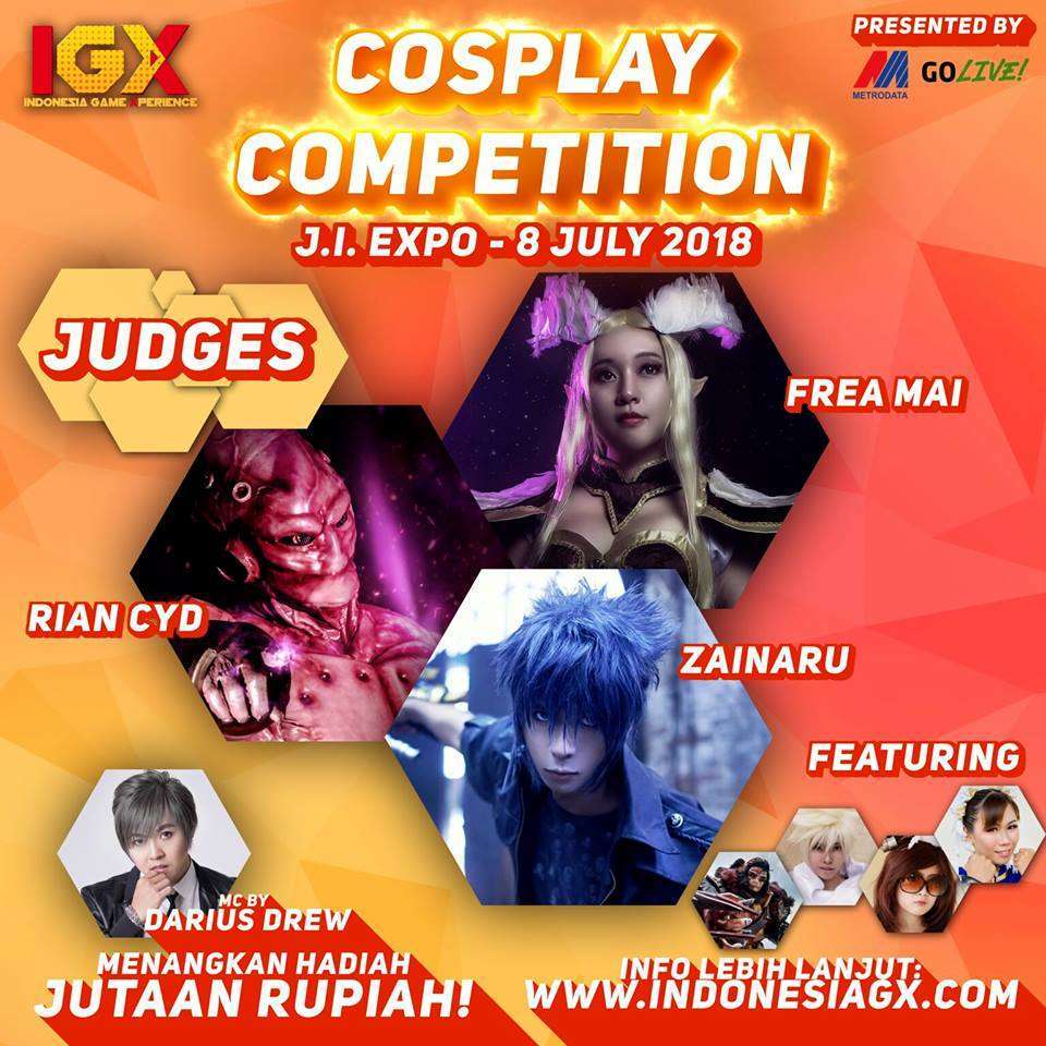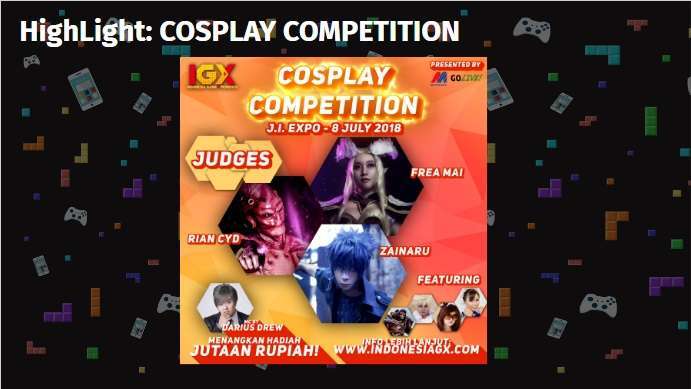 Acara ini juga akan dipenuhi dengan kompetisi cosplay dan penampilan para cosplayer yang akan memeriahkan sekaligus menghibur para pengunjung.