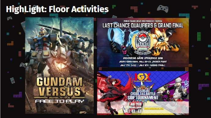 Dalam gelaran dua hari tersebut, IGX 2018 akan menyuguhkan berbagai acara seru seperti esports, Virtual Reality (VR), Augmented Reality (AR), arcade amusement, retro game, bazaar toys dan games, unique live experiences dengan publishers dan hardware manufacturers, table top area (board game dan trading card game), bahkan berbagai aktivitas untuk wanita dan anak-anak. Sedangkan untuk urusan kuliner, GO-LIVE akan memastikan adanya berbagai macam makanan dan minuman yang tersebar di seluruh area IGX 2018.