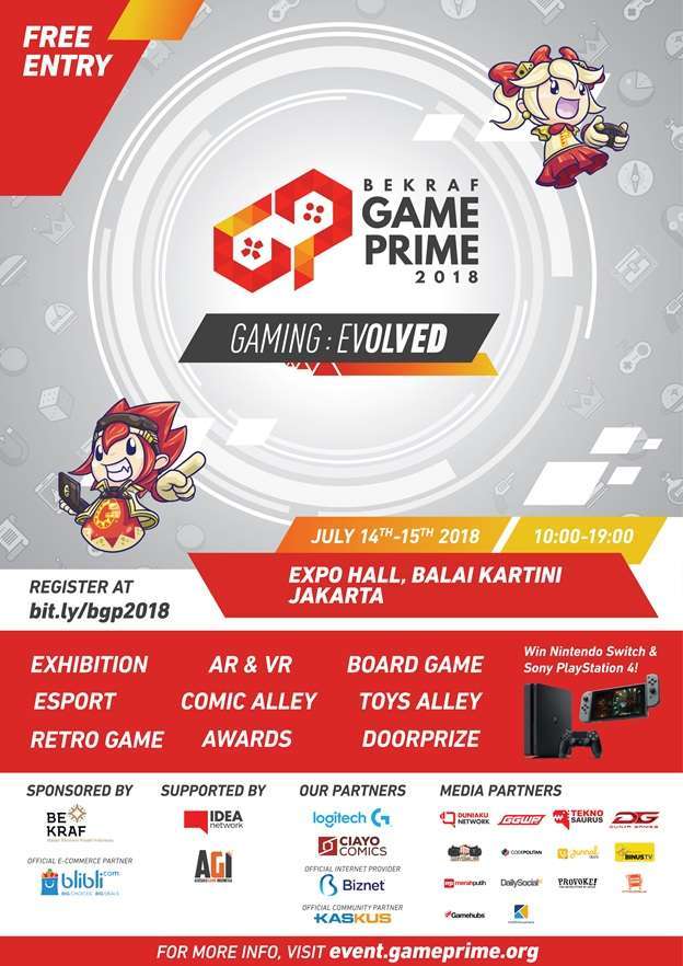 Sudah masuk pamerannya gratis, main game dua hari penuh dan juga bertemu dengan berbagai komunitas se-Indonesia, BEKRAF Game Prime 2018 juga bakal menghadirkan doorprize di akhir hari kedua. Hadiahnya tidak main-main, mulai dari berbagai gaming gear keren, PS4, hingga Nintendo Switch!