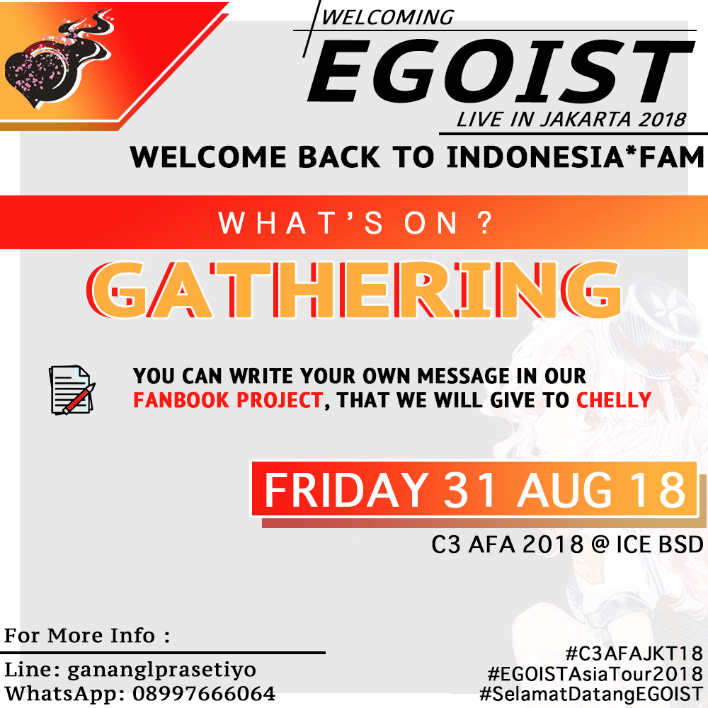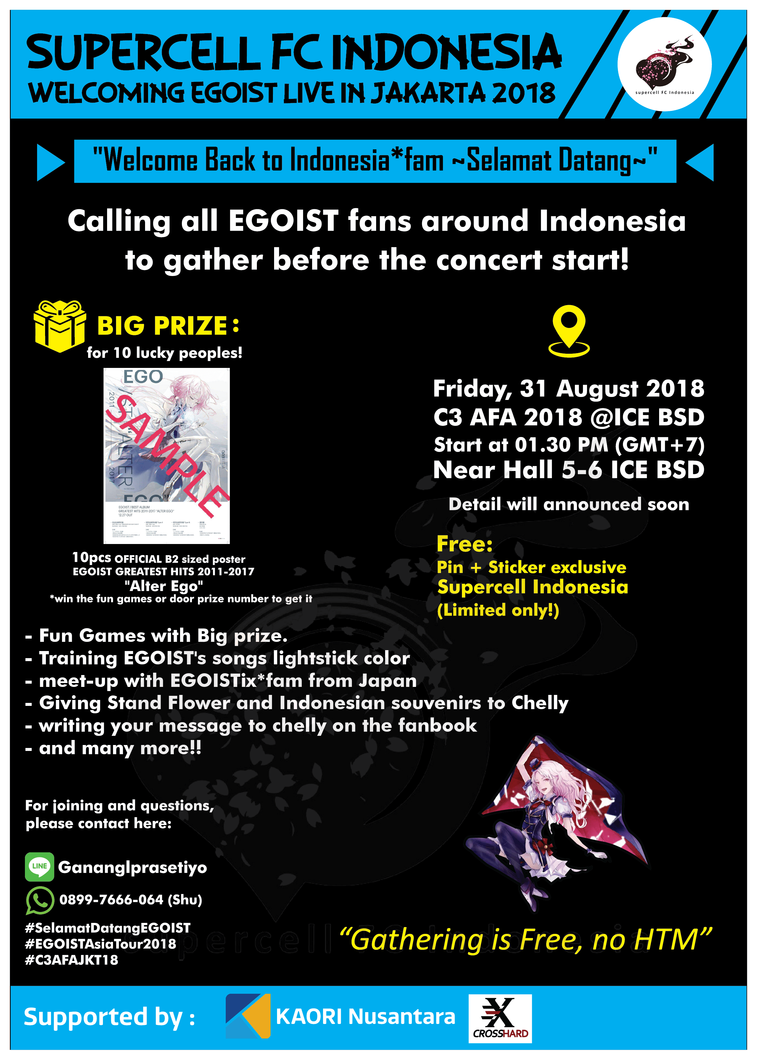 Supercell Indonesia akan mengadakan gathering akbar di C3 AFA Jakarta 2018 nanti dengan judul “Welcome Back to Indonesia*fam ~Selamat Datang~“. Judul tersebut diambil dari salah satu judul lagu EGOIST, “Welcome to the*fam“, yang dalam lagu tersebut juga ada lirik bahasa Indonesia berbunyi “Selamat Datang”. Hashtag yang digunakan untuk gathering ini adalah #SelamatDatangEGOIST.