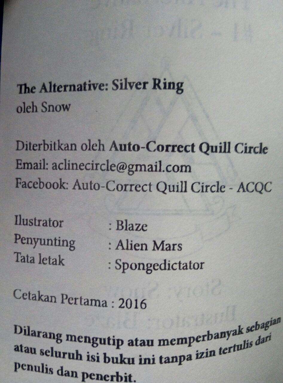 Nampak sebuah buku berjudul The Alternative – #1 – Silver Ring, yang walaupun kecil ternyata cukup tebal, dengan sampul berwarna dominan biru dengan judul yang membuat rasa penasaranku terusik dan gambar gadis dengan jepit rambut yang entah mengapa mengingatkanku pada sebuah logo perangkat lunak yang pernah populer melindungi komputer sekolahku dari serangan program-program jahat.