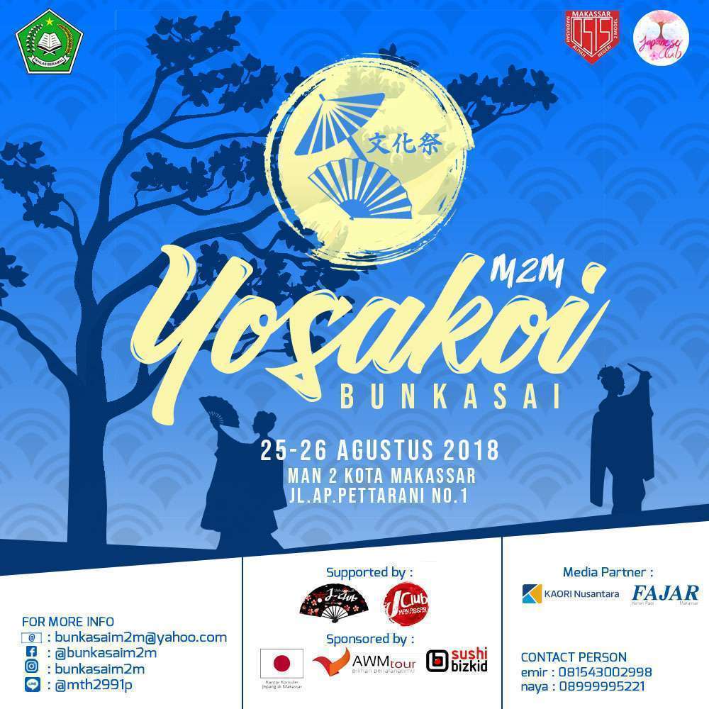 Sudah pernah ke festival bunkasai yang udah dilaksanakan tahun lalu di MAN 2 Model Makassar? Nah! Kali ini kami dari MAN 2 Model Makassar akan mengadakan kembali untuk yang ketiga kalinya pada 25-26 Agustus 2018 bertajuk Yosakoi Bunkasai! Tapi, pada 25 Agustus khusus diperuntukan untuk perserta lomba saja.