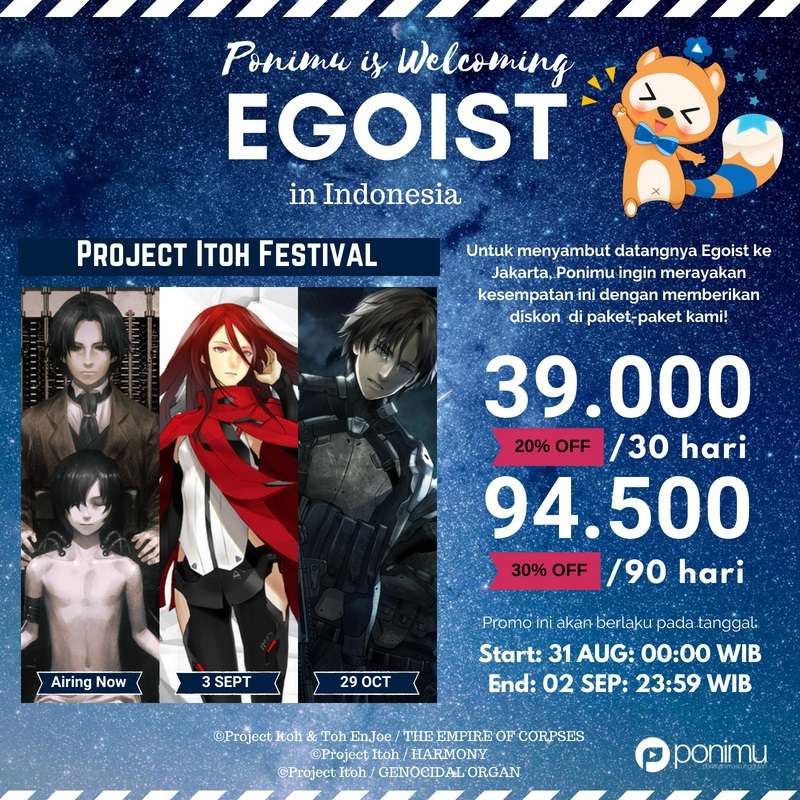 Grup musik kenamaan dari Jepang Egoist dikabarkan akan datang ke Jakarta untuk mengisi acara salah satu gelaran Jejepangan terbesar di Jakarta. Egoist merupakan sebuah duo antara komposer musik Ryo dari Supercell, dan Chelly sebagai penyanyinya. Nama keduanya pasti sudah cukup terkenal di antara teman-teman mengingat sudah banyak lagu tema anime yang dibawakan oleh Egoist. Mengingat 3 buah movie dari seri Project Itoh yang dibawakan oleh Ponimu memiliki lagu-lagu tema yang dibawakan oleh Egoist, Ponimu ingin memberikan potongan harga dalam kesempatan ini. Ponimu akan memberikan potongan 20% untuk subskripsi 30 hari, dan 30% untuk subskripsi selama 90 hari lewat Egoist Festival.