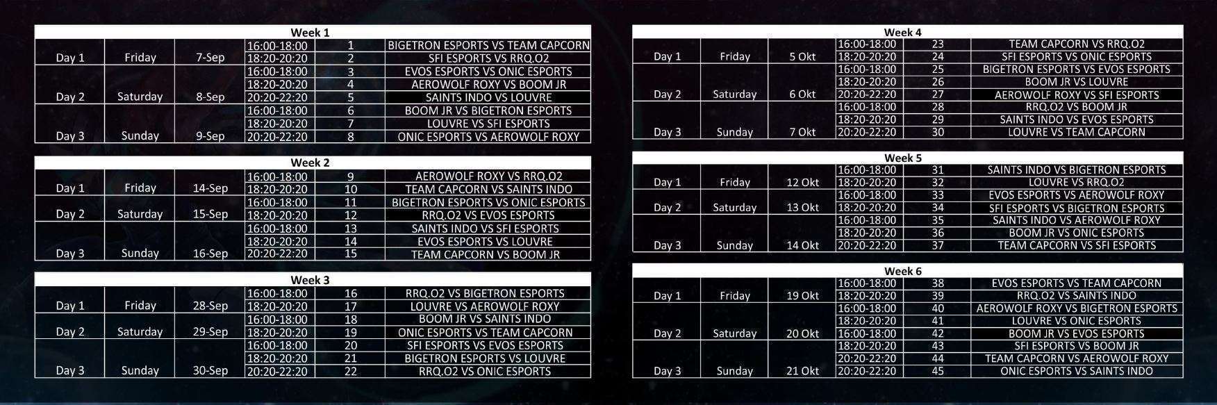 Di Season 2 ini, Regular Season akan berlangsung selama 6 minggu, yakni sampai tanggal 21 Oktober 2018. Berikut ini adalah jadwal Regular Season di Season 2 yang dilaksanakan setiap hari Jumat, Sabtu, dan Minggu.