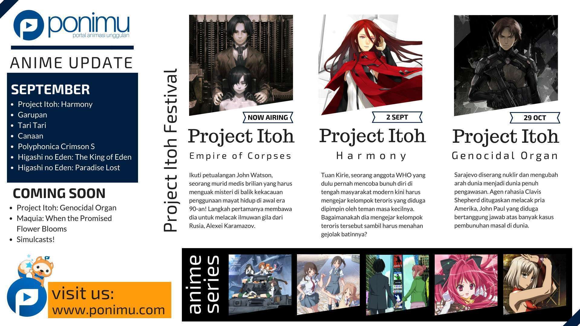 Bulan ini sudah masuk ke bulan kedua dari fase soft launching Ponimu sejak pertama kali diluncurkan pada tanggal 30 Juli lalu. Saat itu, konten Ponimu masih bisa dihitung dengan jari saja, yaitu Project Itoh: Empire of Corpses, Polyphonica, dan Higashi no Eden. Pengguna juga mendapatkan 3 hari gratis untuk mencoba menonton anime-anime Ponimu.