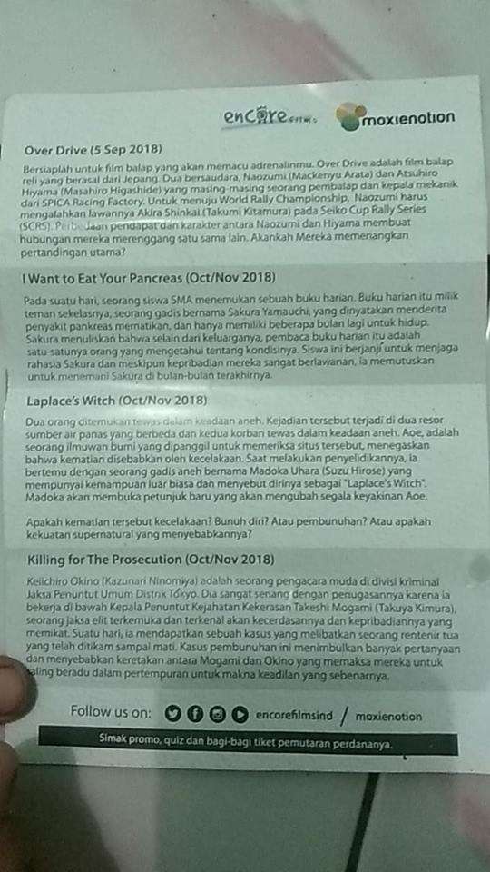 Ingin bersedih ria sembari mengusap air mata, dengan bergulung-gulung kertas tisu, dengan menonton film anime sedih nan menyayat hati, I Want to Eat Your Pancreas? Film ini rupanya akan segera diputar di Indonesia sekitar bulan Oktober atau November 2018 mendatang. Hal itu terungkap melalui brosur yang dibagi-bagikan oleh Encore Films dan Moxienotion pada perhelatan C3 AFA Jakarta 2018 lalu. Dalam brosur tersebut disebutkan juga mengenai 3 film Jepang lain yang akan turut diputar di Indonesia, yaitu Over Drive yang sudah dirilis di bioskop sejak 5 September 2018 lalu, dan juga Laplace’s Witch Killing for the Prosecution yang sama-sama akan dirilis di Indonesia pada bulan Oktober atau November 2018 mendatang. Di Jepang sendiri film anime I Want to Eat Your Pancreas telah dirilis ssejak 1 September 2018 lalu.