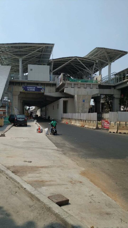 Memulai perjalanan, Tim Cemplus berjalan kaki dari Halte Pemuda Rawamangun menuju Stasiun LRT Velodrome tempat berlangsungnya Uji Coba LRT, Dilihat dari luar area stasiun, Stasiun Veledrome untuk saat ini masih terlihat belum 100 persen selesai dikerjakan, masih banyak petugas proyek yang mondar-mandir membangun stasiun ini. Satu yang patut disoroti adalah akses parkir yang belum tersedia saat kami menyambangi Stasiun Velodrome. Hanya tersedia lahan untuk drop out calon pengguna LRT ini dan lahan parkir untuk kendaraan umum masih belum tersedia. Jadi untuk menggunakan LRT saat ini, calon penumpang tampaknya harus menggunakan kendaraan umum seperti TJ (Trans Jakarta) atau jasa transportasi online untuk menuju stasiun LRT