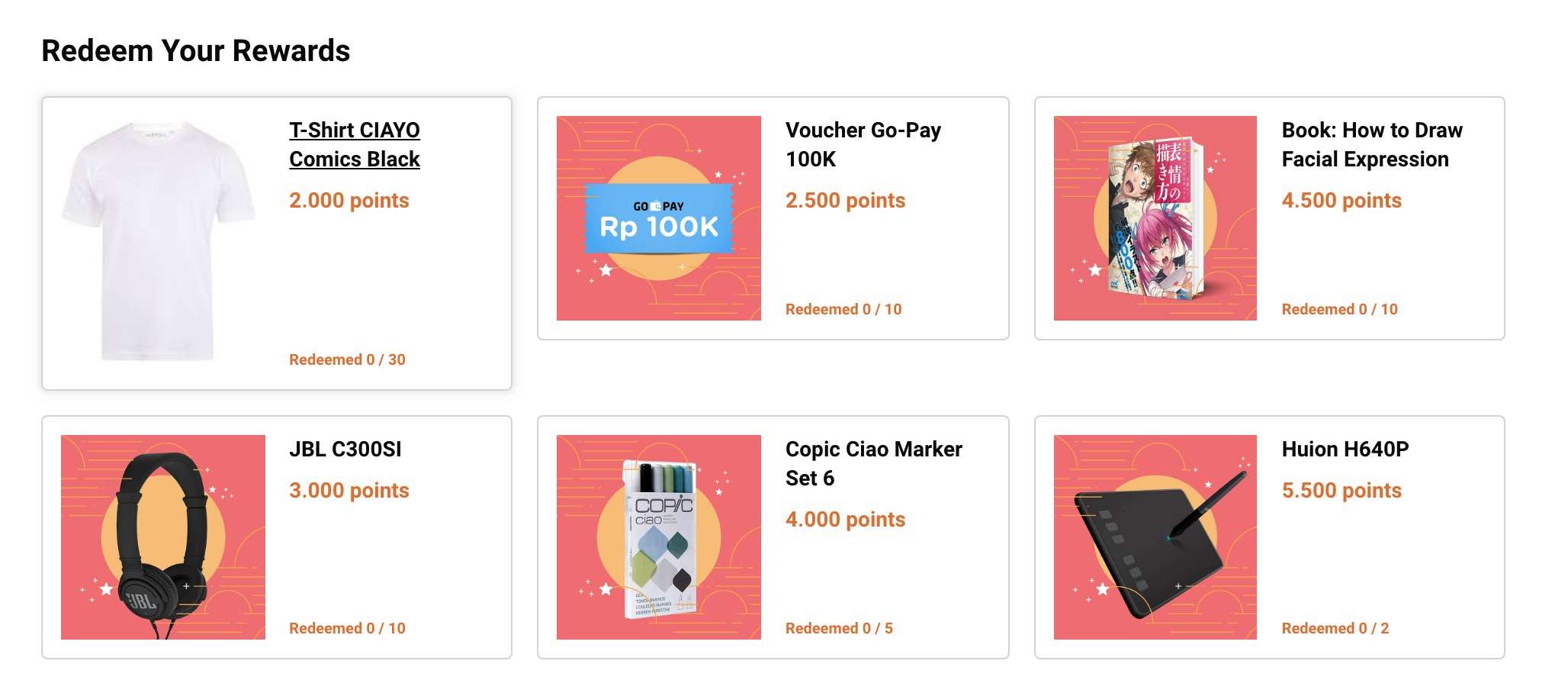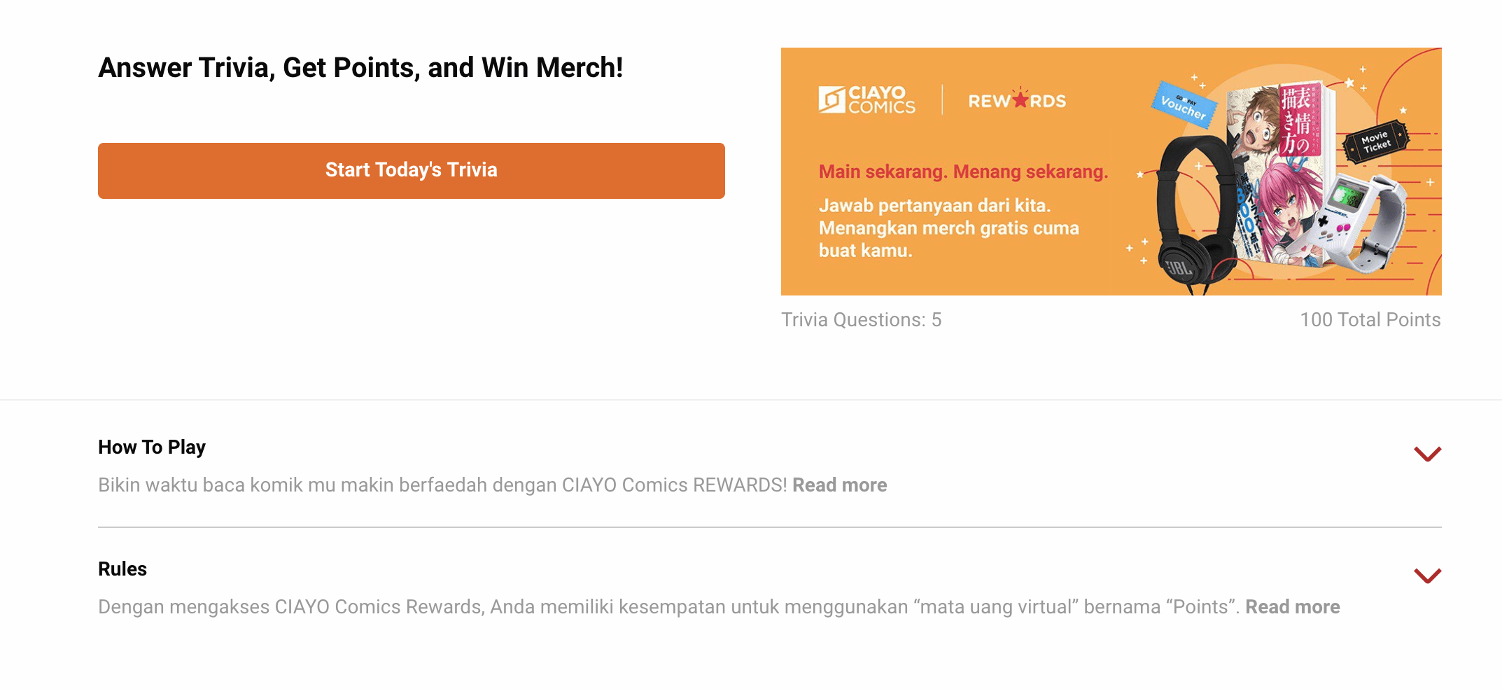 Setiap akun yang berpartisipasi dalam program ini akan mendapatkan poin. Poin didapatkan dengan cara menjawab kuis trivia yang berisi pertanyaan seputar komik yang ada di CIAYO Comics. Setiap pertanyaan yang dijawab dengan benar akan mendapatkan 20 poin dan untuk setiap akun baru akan mendapatkan tambahan 500 poin. Setiap akun mempunyai satu kali kesempatan untuk mengumpulkan poin setiap harinya. Poin yang terkumpul dapat ditukarkan dengan hadiah yang menarik seperti voucher Go-Pay, Voucher Pulsa, tiket bioskop, dan berbagai merchandise menarik dari CIAYO Comics.