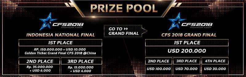 Hadiah yang diperebutkan oleh para finalis pada turnamen CFS 2018 Indonesia National Final adalah sebagai berikut: