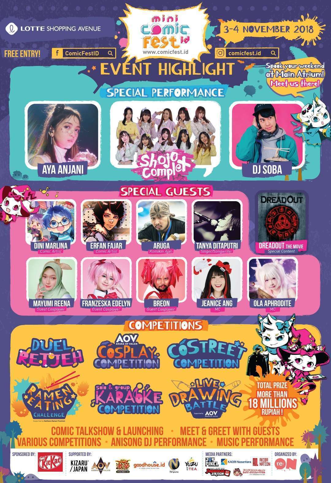 Comicfest ID 2018 juga akan semakin bertambah seru dengan kehadiran bintang-bintang seperti Tanya Ditaputri, AYA Anjani, Shojo Complex, hingga DJ Soba yang akan menghibur para pengunjung dengan performa mereka. Tak lupa Ola Aphrodite akan bertindak sebagai MC selama acara.