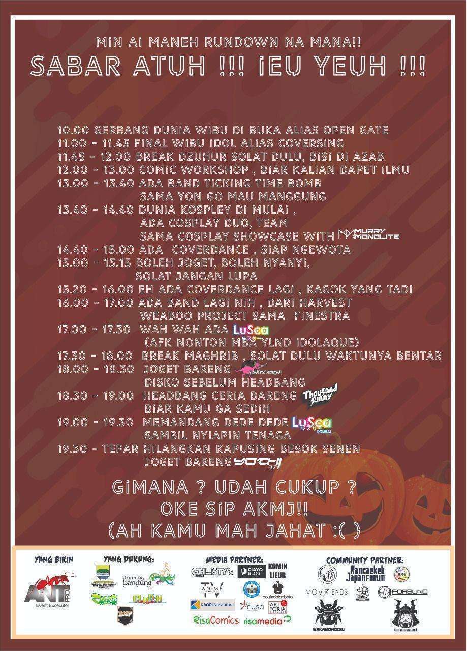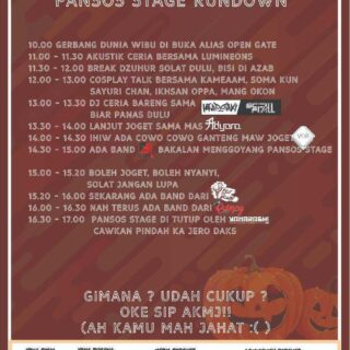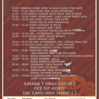 Mengusung tema “Maju Kena, Mundur Kena” seperti judul film Warkop DKI, event Bandung Wundurland hadir dengan banyak sekali acara seru, mulai dari performance dan lomba Cosplay, Band, Dance, Nyanyi, hingga EDM. Tak hanya itu, event ini juga semakin meriah dengan berbagai konten yang juga menarik, seperti talkshow bareng kreator dan cosplayer, bazaar, hingga rental PeeS! Harga tiket acaranya juga bisa dicek lewat poster di bawah ini.