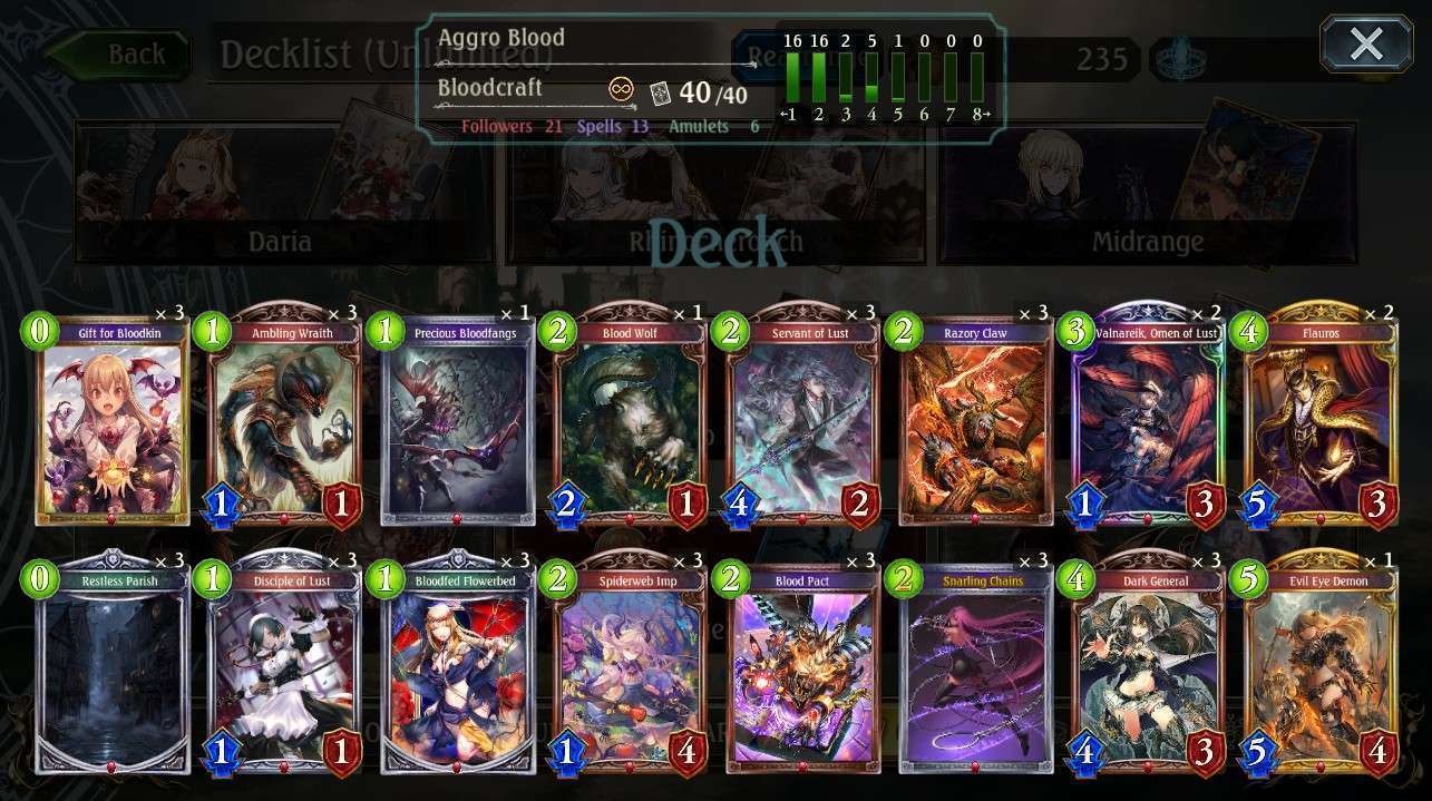 Tipe Deck ini sangat agressif, dengan komposisi kartu yang hanya diisi kartu yang Low-Cost, memungkinkan kalian untuk memainkan kartu dari turn pertama. Tanpa membuang satu playpoint yang tersisa. ini menjelaskan kenapa deck ini biasanya diisi oleh kartu ber-cost kecil yang sangat kuat, diantaranya follower yang mempunyai Storm atau Spell yang bisa memberikan damage ke leader musuh.