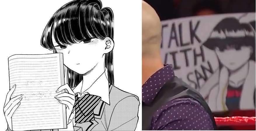 Pada acara gulat WWE Monday Night RAW yang ditayangkan pada Senin (3/12) malam waktu Amerika (atau Selasa (4/12) pagi waktu Indonesia), ternyata ada seorang penonton yang kedapatan membawa banner bergambar Komi-san. Banner ini muncul pada segmen ketika Baron Corbin, sang GM sementara RAW, merayakan keberhasilan Drew McIntyre yang berhasil mengalahkan Kurt Angle di beberapa episode lalu di atas ring. Di banner tersebut tertulis “Talk With Komi-san” yang tampaknya merupakan plesetan dari slogan “Walk With Elias” yang merupakan kalimat khas milik pegulat WWE lainnya, Elias.