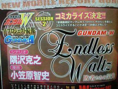 Majalah bulanan Gundam Ace yang diterbitkan oleh Kadokawa Shoten pada edisi September telah mengumumkan pada hari Senin bahwa pembuatan sebuah komik yang diadaptasi dari Mobile Suit Gundam Wing: Endless Waltz telah disetujui.