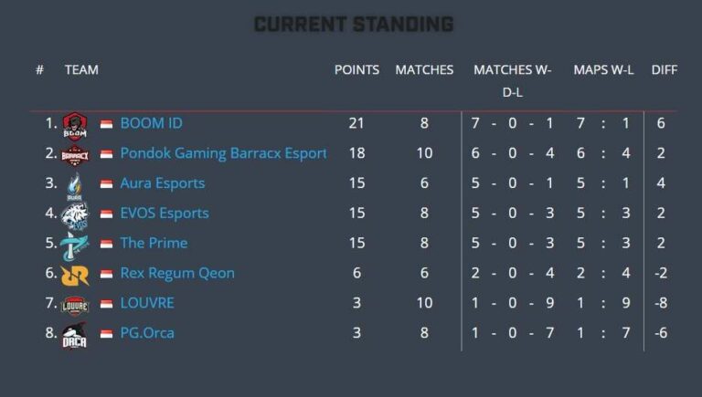 Hanya dengan total 4 pertandingan, BOOM.ID berhasil memantabkan posisinya sebagai pemuncak klasemen. Sedangkan PG.Orca turun sebagai peringkat terbawah klasemen sementara.
