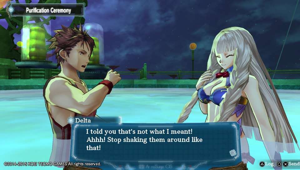 Ya, di gim Ar nosurge ada sistem untuk mandi bareng bernama Purification. Berhubung ini bukan gim dewasa, tentunya mereka mandi masih dengan menggunakan baju renang (Cuma berendam bersama di satu tempat saja sih, bukan benar-benar mandi). Selain untuk cuci mata, Purification juga digunakan untuk bercakap-cakap dan memasang Genometrica Crystals dari Genometrics ke badan para pengguna Song Magic yaitu, Ion dan Casty (nantinya bisa juga mengajak karakter lain, tetapi hanya untuk diajak ngobrol). Ada 5 tempat yang bisa dipasang Genometrica Crystals yaitu kepala, lengan, dada, perut, dan kaki. Di awal permainan, pemain tidak dapat memasang 5 sekaligus karena para heroine tersebut dianggap belum mau ‘terbuka’ dengan kita dan belum mau untuk disentuh di area yang… sensitif.