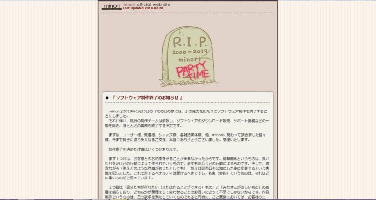 Kali ini kita mendapatkan kabar bahwa studio minori akhirnya akan tutup dan berhenti produksi mulai tanggal 28 Februari 2019. Hal ini disampaikan langsung oleh perwakilan dari studio ini, Nobukazu Sakai atau yang dikenal sebagai nbkz melalui website resminya (harus diakses melalui alamat IP Jepang). Info ini disertai dengan pengumuman terakhir mereka yang berjudul “Sono Hi no Kemono ni wa” telah selesai dikerjakan pada 25 Februari lalu.