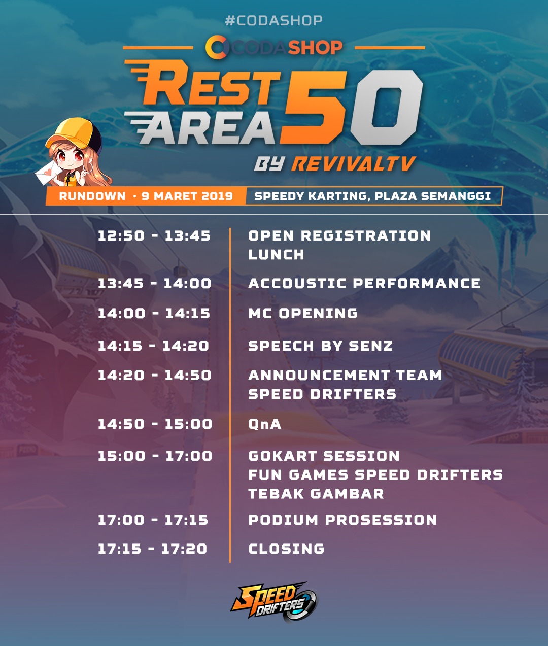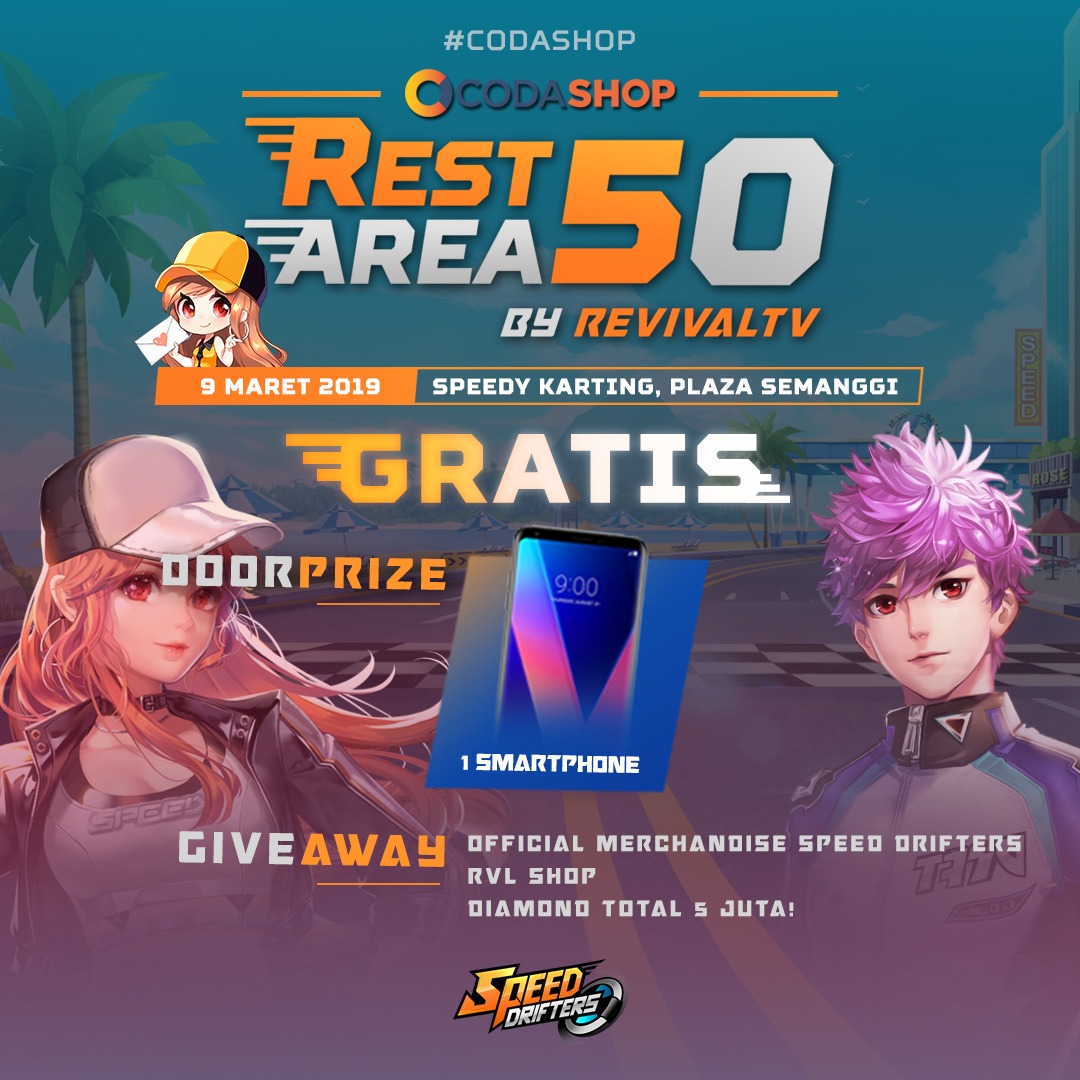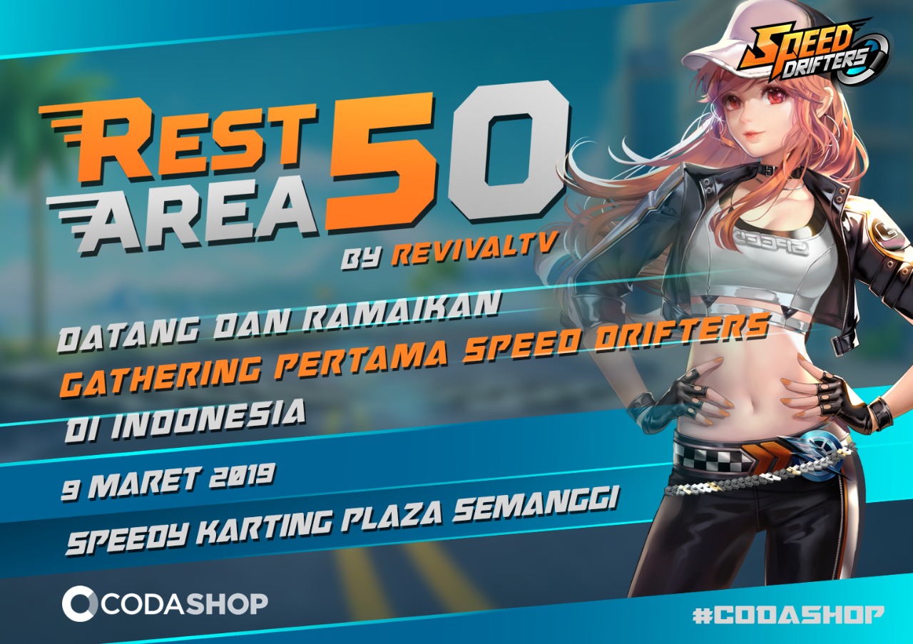 Acara Gathering yang diberi tajuk Rest Area 50 ini akan diadakan pada tanggal 9 Maret mendatang, berlokasi di Speedy Karting Plaza Semanggi. Pemain yang datang ke gathering bisa menikmati serangkaian acara menarik yang sudah dipersiapkan oleh RevivalTV. Selain itu, mereka juga berkesempatan mengikuti beragam mini games dan juga door prize berhadiah smartphone, merchandise official Speed Drifters, dan Diamond senilai 5 juta rupiah dari Codashop.