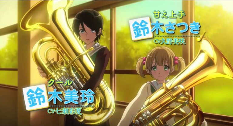 Kiri: Ayaka Nanase sebagai Mirei Suzuki (kelas satu, pemain tuba); Kanan: Misaki Kuno sebagai Satsuki Suzuki (kelas satu, pemain tuba)