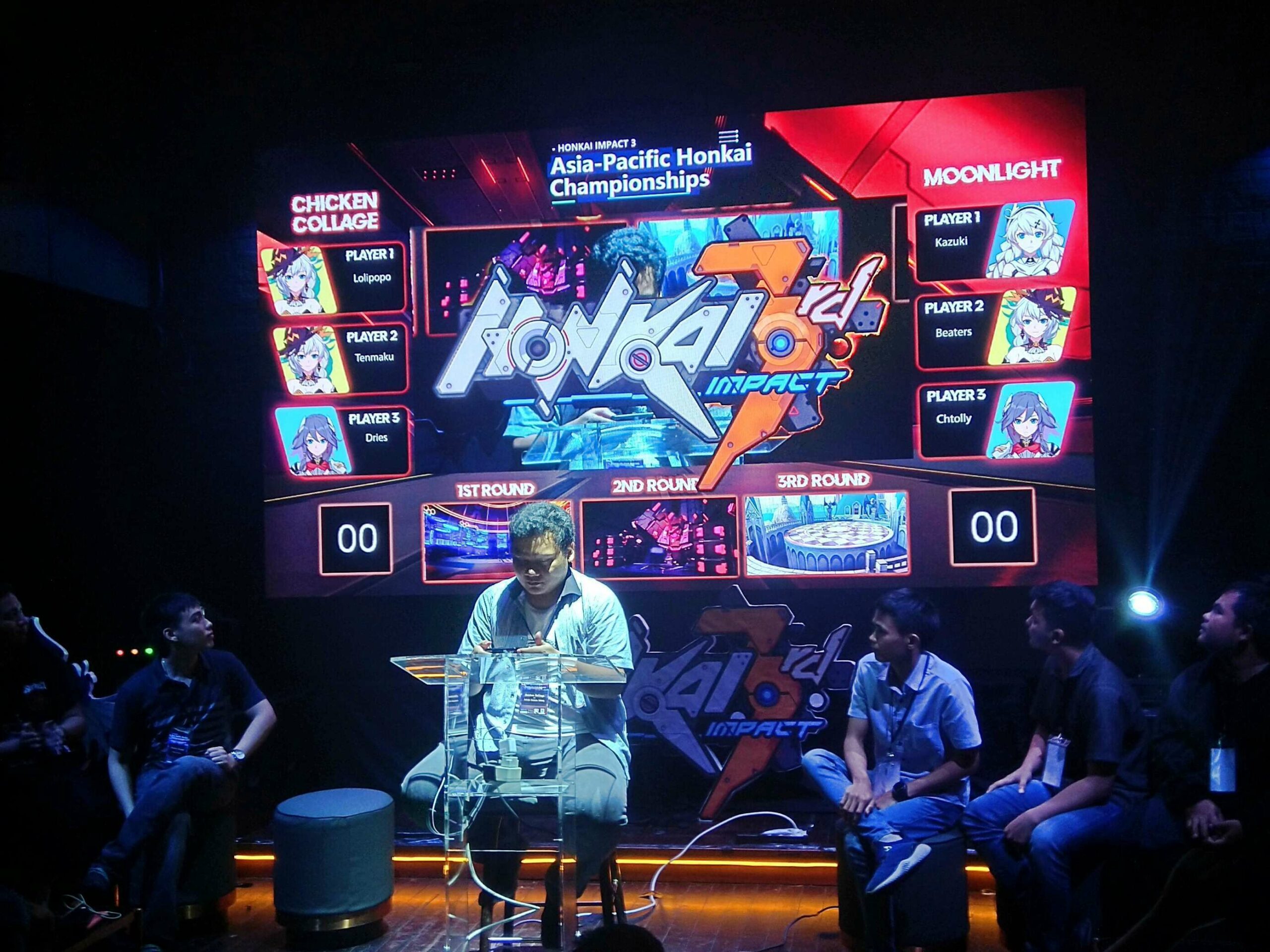 Lalu, bagaimana dengan babak grand finalnya? Tim Moonlight langsung tampil menekan sejak ronde pertama. Bila tim lainnya memilih menggunakan karakter Valkyrie S-Rank yang meta dalam kombinasi line-up-nya (pemain menggunakan 3 karakter Valkyrie yang dapat dipakai bergantian dalam satu stage), seperti Kiana – Herrscher of The Void, Fu Hua/Fuka – Phoenix, atau Himeko – Vermillion Knight, mereka menggunakan Kiana – Valkyrie Ranger sebagai salah satu line-upnya. Dengan memanfaatkan skill Ultimate Evasion-nya, Singularity, secara cermat untuk mengumpulkan musuh sebelum dihabisi oleh karakter lain, mereka mampu menyelesaikan match dengan tempo yang jauh lebih singkat dibanding tim lainnya. Di ronde pertama, tim Moonlight langsung unggul 1-0 melawan tim Chicken College.