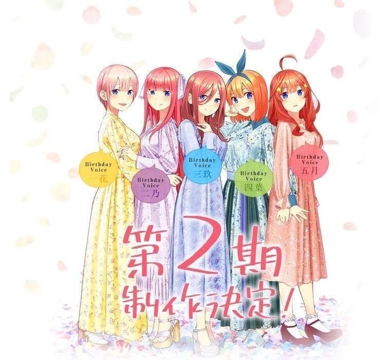 Kabar gembira bagi para penggemar 5 bersaudari Nakano dari serial Go-Toubun no Hanayome! Karena animenya akan berlanjut ke musim kedua. Masih belum ada informasi lebih lanjut kapan musim keduanya akan dirilis.