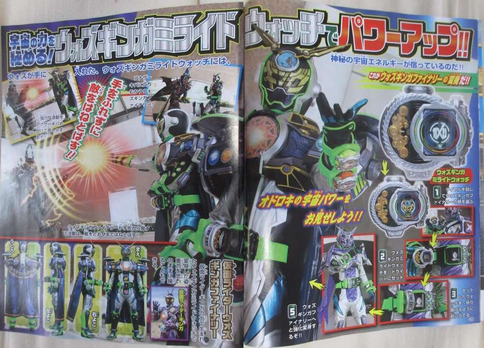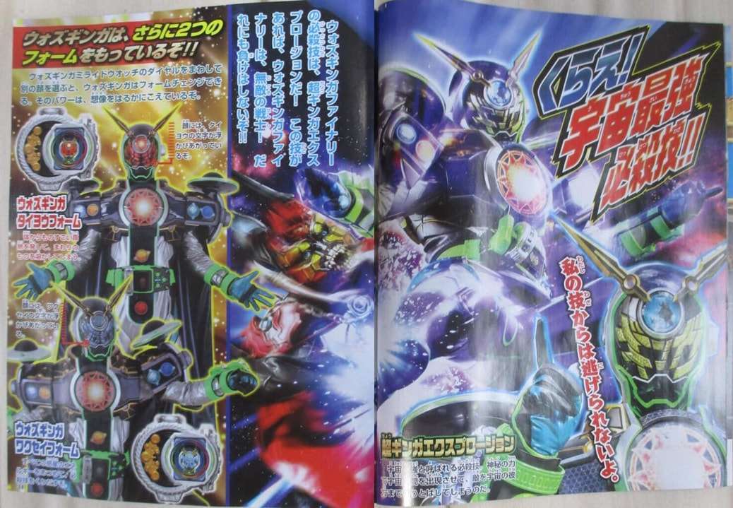Setelah form lainnya terungkap sejak beberapa waktu lalu dari bocoran gambar katalog mainan di internet, kali ini di dalam sebuah majalah edisi terbaru dari Terebi-Kun, wujud baru dan final form dari Kamen Rider Woz ini akhirnya sudah terlihat cukup jelas. Di majalah itu terungkap kalau form Woz Ginga Finally ini akan memulai debutnya di bulan Mei pada episode 36 (19/05).