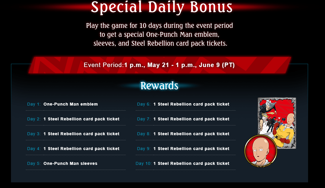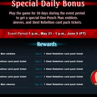 Selain menghadirkan leader baru, Shadowverse juga mengadakan event yang menarik di update ini, yang pertama adalah daily login yang berhadiah 1 tiket Steel of Rebellion, emblem, dan sleeve. Yang kedua adalah event treasure chest, yang berhadiah 1 tiket kartu dan kartu eksklusif One-Punch Man (Animated).