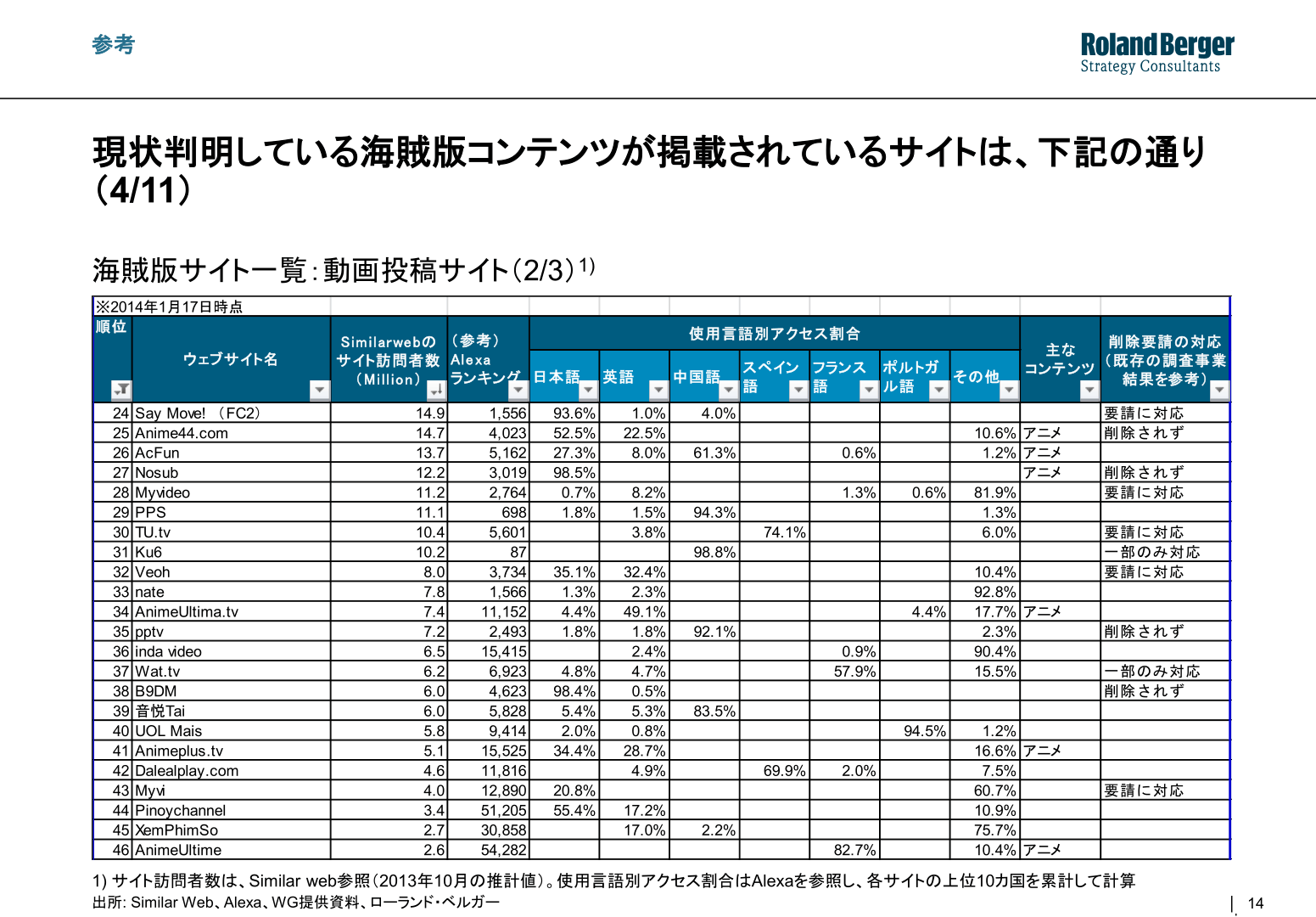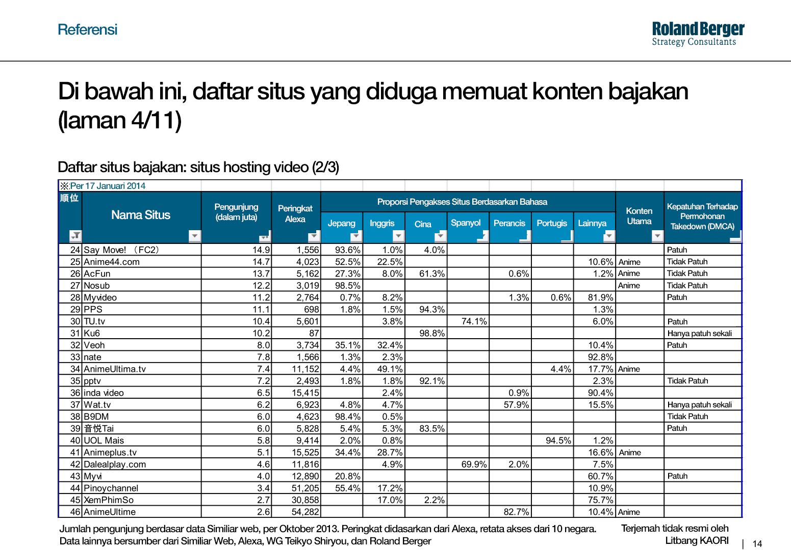 Dalam dokumen tersebut, tautan-tautan yang dimuat adalah bagian dari survei Roland Berger terhadap populasi situs-situs konten bajakan, terbagi ke dalam tiga kolom: situs streaming/baca komik, situs berbagi berkas, dan situs umum seperti Nicovideo dan Youtube.