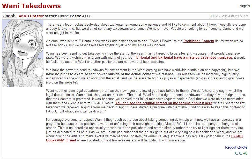 Menurutnya, permintaan DMCA yang ia kirimkan sebelumnya ke situs e-hentai tidak ditanggapi sama sekali.