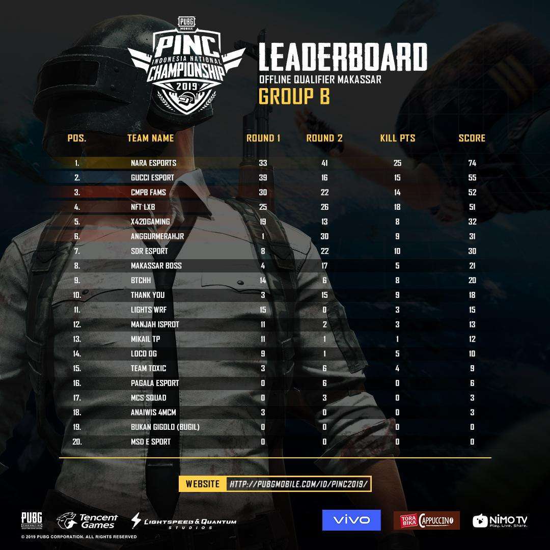 Group B sendiri diisi oleh beberapa organisasi esports berkembang seperti NARA Esports, CMPB Esports, NFT Esports dan lain sebagainya. Tentunya, dengan dukungan penuh dari pihak profesional di belakang, para squad ini mampu dengan mudah menduduki posisi 6 besar dan lolos ke babak final group. Bahkan untuk NARA sendiri sebagai pemuncak grup mereka mampu memimpin klasemen dengan perolehan 74 poin.