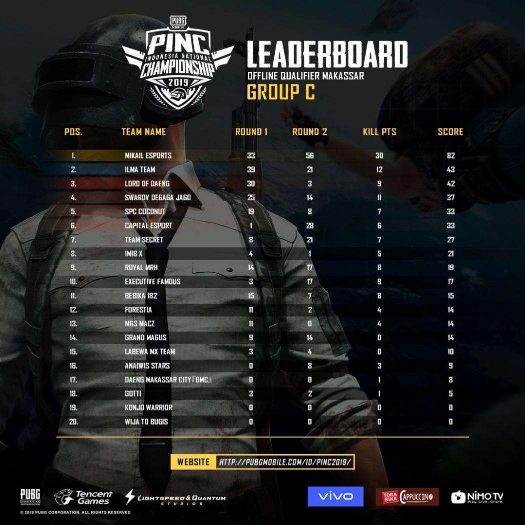 Berpindah ke Group C, MIKAIL ESPORTS dengan sangat mudah mampu meng-outplayed squad lainnya dalam dua game berlangsung. Total mereka berhasil mengumpulkan 30 Kill dengan perolehan poin akhir sebesar 82. Berbanding terbalik dengan posisi 2 (ILMA TEAM) dan 3 (Lord of Daeng) yang harus bersusah payah lolos dengan poin akhir masing-masing 43 dan 42.