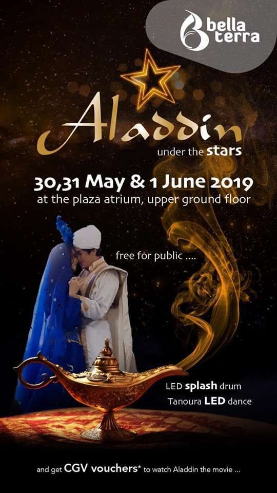 Di tahun 2019 ini Walt Disney Pictures telah meremake salah satu film animasi klasiknya, Aladdin, menjadi sebuah film live action. Dalam rangka menyambut film live action yang telah dirilis secara internasional sejak akhir bulan Mei 2019 lalu, dan juga menjelang momen Lebaran, Bella Terra Lifestyle Center menggelar sebuah pementasan drama panggung musikal Aladdin yang diberi judul Aladdin Under the Stars.