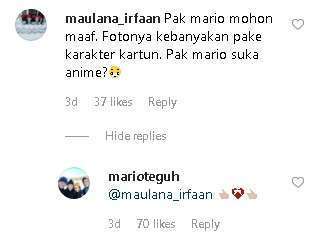 Akun @maulana_irfaan berkomentar, “Pak mario mohon maaf. Fotonya kebanyakan pake karakter kartun. Pak mario suka anime?” Komentar tersebut sayangnya hanya ditanggapi oleh akun Instagram Mario Teguh dengan emotikon dua jempol dan gambar hati di tengahnya.