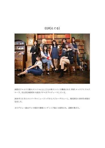EGR 「EGR 」(Eguru) adalah grup idol beraliran Pop Rock yang diproduseri oleh Takada Metal dari ELLEGARDEN. Eguru beranggotakan 2 orang member, dari 6 orang original member dari Enka Girls. Pada tahun 2018, Eguru debut dibawah naungan Universal Music dan pada hari pertama salesnya langsung terjual habis. Selain itu, lagu debutnya terpilih menjadi salah satu lagu tema acara televisi TV Tokyo.