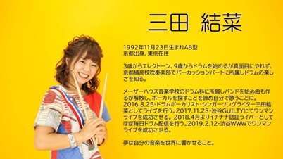Pada 25 Agustus 2016, ia menyelenggarakan live sebagai Mita Yuina, seorang drum-vocalist sekaligus single song writer. Pada 23 November 2017, Mita juga turut menyukseskan acara One Man Live di Shibuya GUILTY. Kemudian, mulai April 2018, hamper setiap hari Mita menyelenggarakan broadcast drum sebagai pemain bersertifikat Ichinana. Pada 12 Februari 2019, ia juga turut menyukseskan One Man Live di WWW Shibuya. Impiannya adalah untuk memperdengarkan lagu ciptaannya keseluruh dunia. Di Ennichisai 2019, Ia akan memberikan penampilan yang all out!
