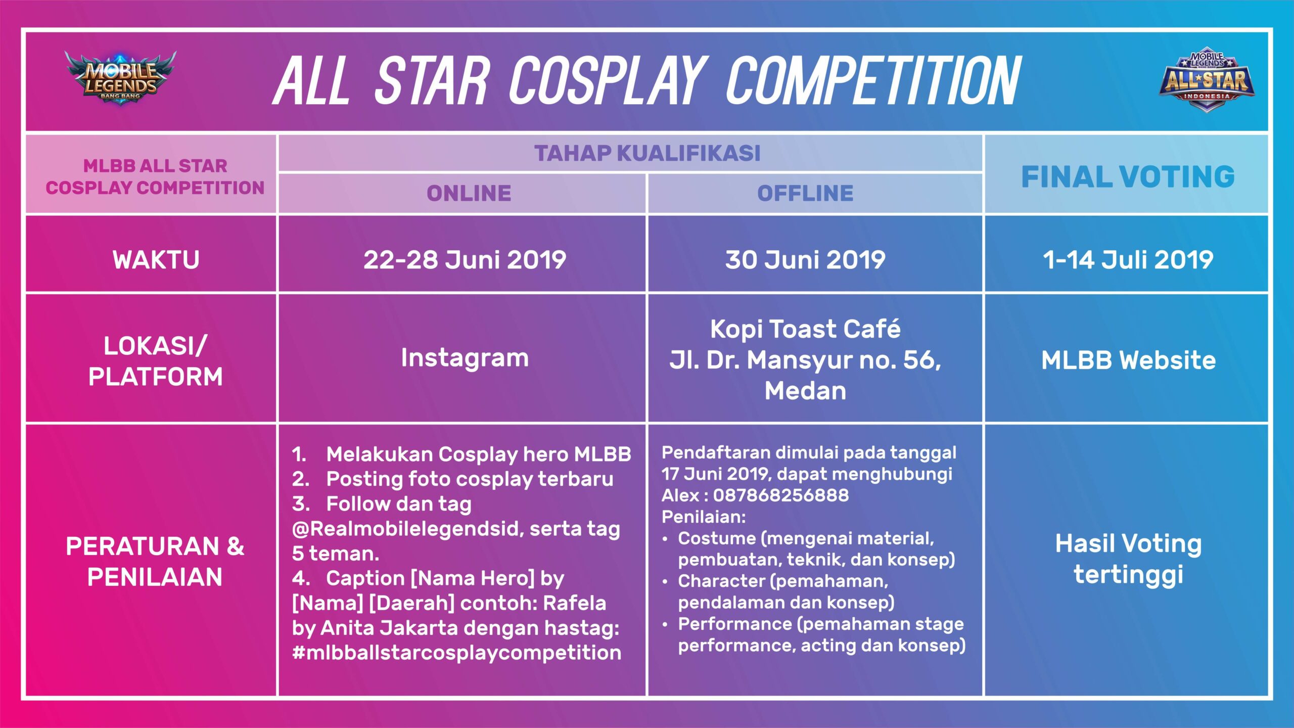 Selain voting tim ALL STAR , juga diadakan Cosplay Competition, dimana semua Cosplayer MLBB dapat berpartisipasi untuk mendapatkan hadiah, dengan TOP 3 pemenang favorit akan diundang dan diberikan penghargaan pada puncak acara.