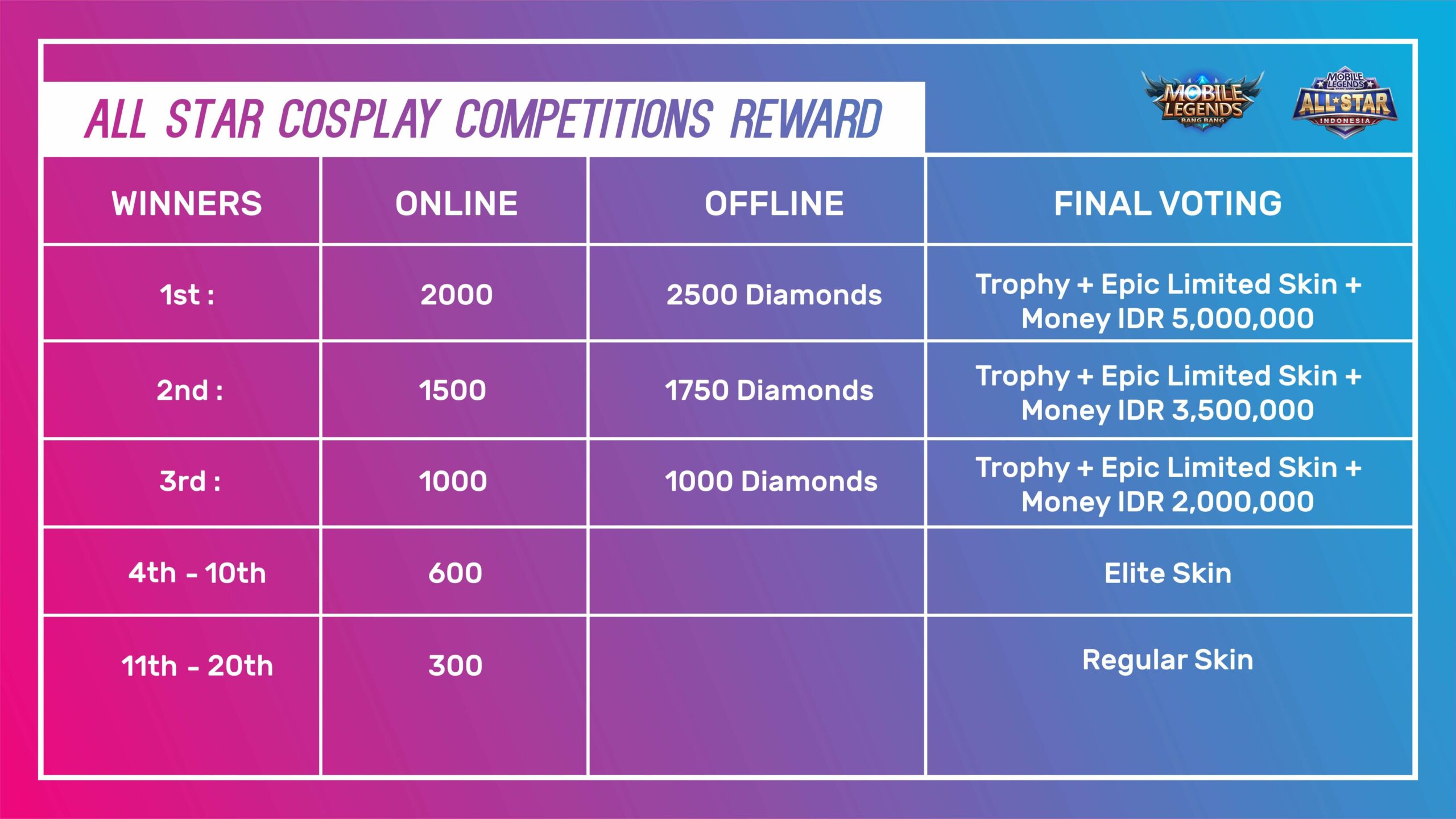 Untuk Pro player dengan hasil voting tertinggi (Juara 1) akan dibuatkan emoticon/ Battle Emote Permanen di dalam game permanen, dan pro player dengan hasil voting ke 2-4 akan mendapat limited emoticon/ Battle Emote Permanen di dalam game 60 hari. Pemain yang telah melakukan voting untuk juara 1-4 akan mandapatkan hadiah emoticon/ Battle Emote Permanen di dalam game dari Pro player yang telah di vote sebelumnya. Selain itu pemain yang telah melakukan voting juga berkesempatan mendapatkan hadiah skin, tiket All Star dan hadiah menarik lainnya. Link untuk voting: activity.mobilelegends.com/id/allstar.