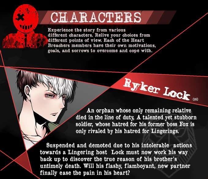 Dalam novel visual Lingering pemain akan disuguhkan kisah dari para Heart Breachers tersebut. Ada Ryker Lock yang ingin membalas dendam atas kematian saudaranya, ada Cassius Keyes sang pemula, ada Goldie sang pemimpin, ada Fox yang ingin memulihkan reputasi kaum Gold, ada Angel sang navigator, dan sejumlah karakter lainnya.