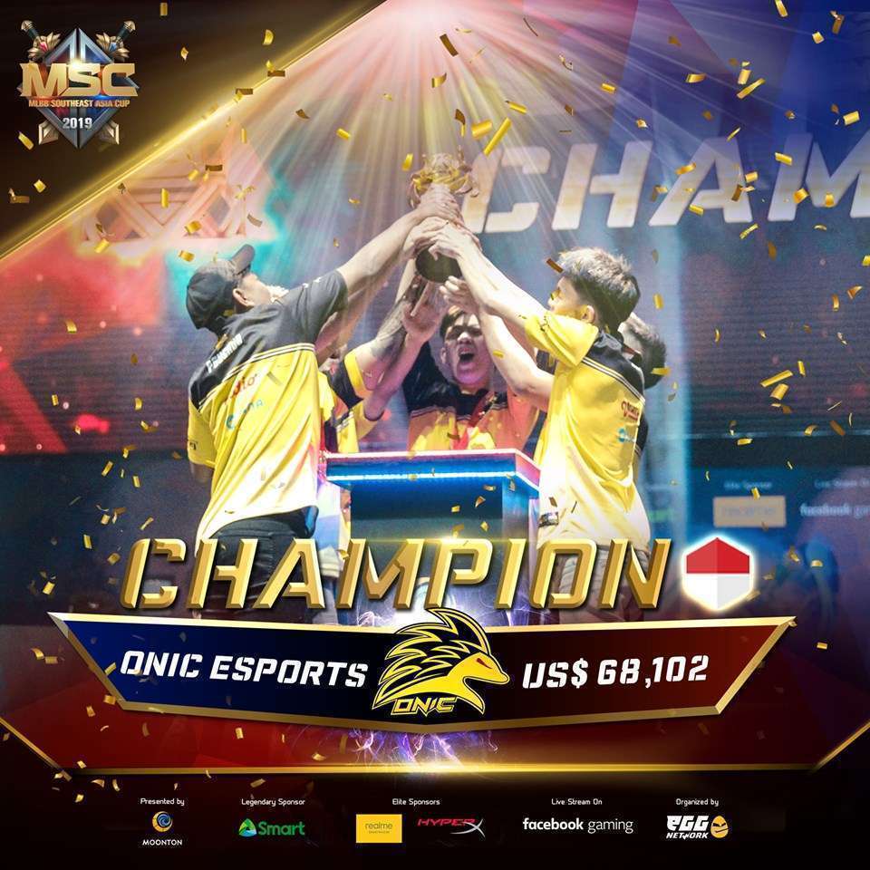 Mobile Legends: Bang Bang Southeast Asia Cup (MSC) 2019, turnamen Mobile Esports paling bergengsi di Asia Tenggara saat ini, berakhir dengan gegap gempita pada hari Minggu, 23 Juni 2019 di Smart Araneta Coliseum. Onic Esports, tim yang berasal dari Indonesia memenangkan gelar juara MSC 2019 setelah mengalahkan teman senegaranya, Louvre Esports dengan skor 3-0 di Final. Juara kedua, dimenangkan oleh Louvre Esports yang juga berasal dari Indonesia dan juara ketiga Arkangel dari Filipina masing-masing membawa pulang US$30,267 dan US$15,133.