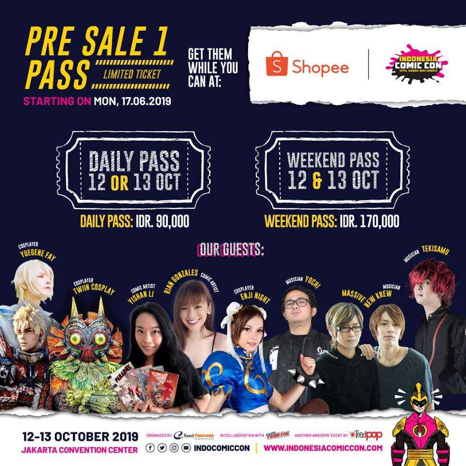 Reed Panorama Exhibitions menggandeng Shopee salah satu E-Commerce terbesar di Asia Tenggara kembali manjakan para fans Budaya Populer (Pop Culture) di seluruh Indonesia, khususnya Jakarta dan sekitarnya dengan kembali menghadirkan para tokoh dan idola budaya populer dari timur, barat dan lokal dalam INDONESIA COMIC CON 2019. Acara ini akan berlangsung pada tanggal 12 – 13 Oktober 2019, di Jakarta Convention Center.