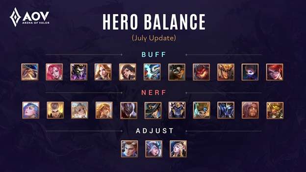 Memasuki update terbaru, Garena AOV Indonesia memberikan beberapa penyesuaian lanjut untuk 25 Hero di dalam Game. Hero Ignis, Diao Chan, Mganga, Lauriel, Violet, Fennik, Slimz, Maloch, Lu Bu, Airi, dan Veres mendapatkan Buff.