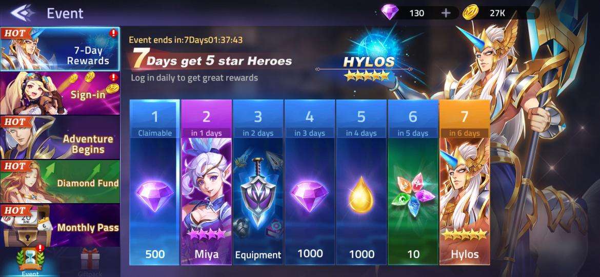 Di beberapa minggu pertama setelah peluncuran, Mobile Legends: Adventure akan bertabur banyak event online dengan hadiah besar. Dengan berpartisipasi di event ini, pemain dapat memperoleh hadiah seperti Diamond, Equipment, Hero dan masih banyak lagi. Selain itu, dalam 10 hari setelah Server diluncurkan, pemain yang menyelesaikan sejumlah Misi dapat memperolah hadiah 5-star Epic Hero – Hylos.