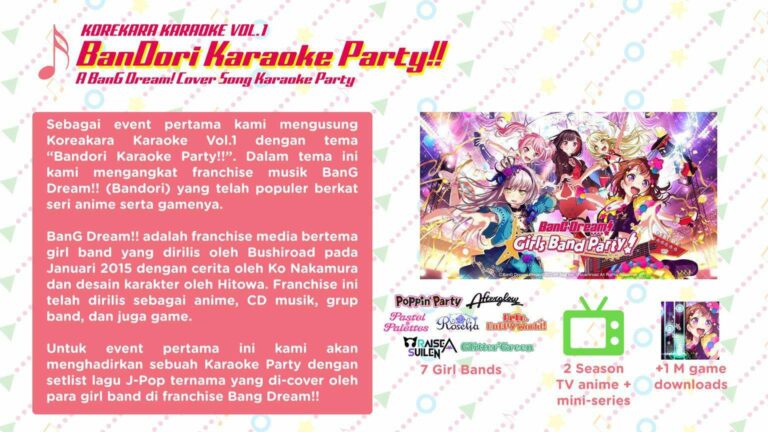 Pada awal Agustus 2019, HIMAJA UI kembali menggelar acara tahunan Gelar Jepang UI. Acara yang diselenggarakan untuk ke-25 kalinya ini menghadirkan beragam keseruan untuk para pecinta kebudayaan pop dan tradisional Jepang. Khusus untuk Gelar Jepang kali ini, komunitas Korekara Karaoke berkolaborasi dengan komunitas Bang Dream Indonesia (BDID) menghadirkan acara karaoke bertajuk Korekara Karaoke vol.1: Bandori Karaoke Party.