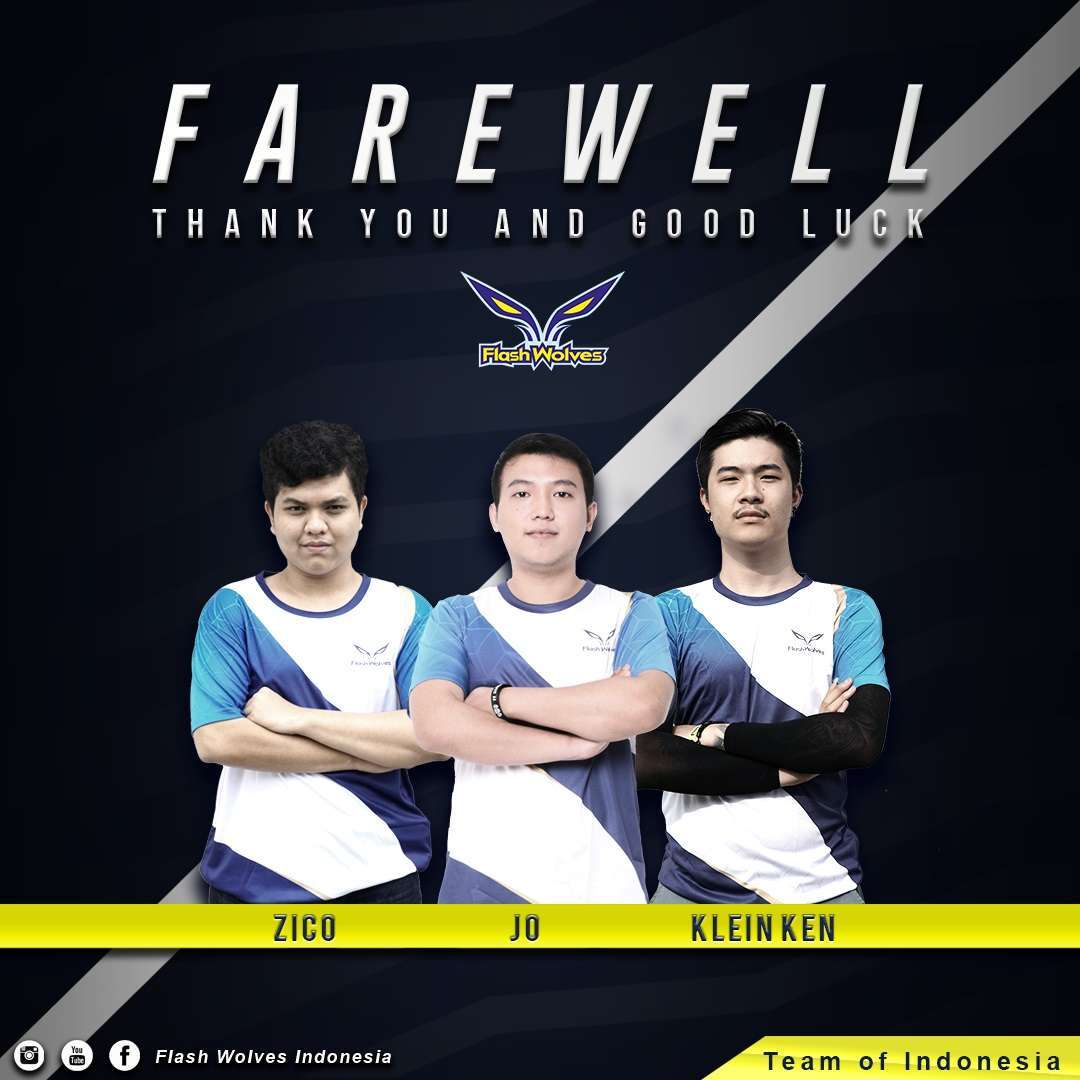Flash Wolves Indonesia resmi melepas tiga pemain mereka dari divisi mobile legends, yaitu Zico “Zico” Ramadhan, Johanes “Jo” & William “Klein Ken” Tjahjadi.