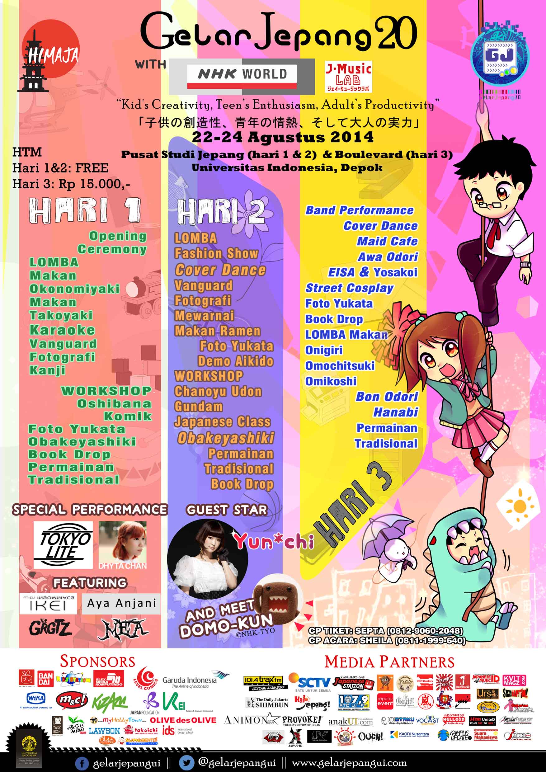 Opening Ceremony | LOMBA Makan, Karaoke, Vanguard, Fotografi, Kanji, FashionShow, DanceCover, Mewarnai, StreetCosplay, DioramaGundam, Komik, FanArt | WORKSHOP Oshibana, Komik, Chanoyu, Udon, Gundam, JapaneseClass | Foto Yukata | ObakeyashikiI | Book Drop | Permainan Tradisional | Demo Aikido | JS Navigator | Maid Cafe | Awa Odori | Eisa | Yosakoi | Omochitsuki | Omikoshi | Bon Odori | Hanabi