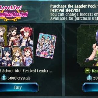 Seperti biasa, pemain bisa mendapatkan 1 paket leader yang berisikan, Leader, Sleeve, Flair dan Emblem ekslusif seharga 500 crystal. Ataupun membeli seluruh Leader tersebut dengan paket yang berisikan semua leader Love Live School Idol Festival dengan bonus Sleeve ekslusif dengan harga 3600 crystal, lebih murah daripada beli satuan. Dan sekarang terdapat promo pembelian Crystalnya yaitu Autumn Crystal Sale, 3600 Crystal hanya dengan $54.99 atau setara dengan 800.000 IDR. Leader tersebut bisa dibeli sampai tanggal 25 September 2019.