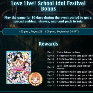 Selain menghadirkan Leader baru, ada juga event yang menarik pada update kali ini. Yang pertama, hanya dengan menyelesaikan misi, pemain bisa mendapatkan kartu eksklusif Love Live! School Idol Festival (Animated). Dan yang kedua adalah, cukup dengan login Shadowverse setiap hari, bisa mendapatkan emblem, tiket Rebellion of Glory, dan Sleeve secara gratis. Dan untuk kedua misi tersebut tersedia sampai tanggal 24 September 2019.