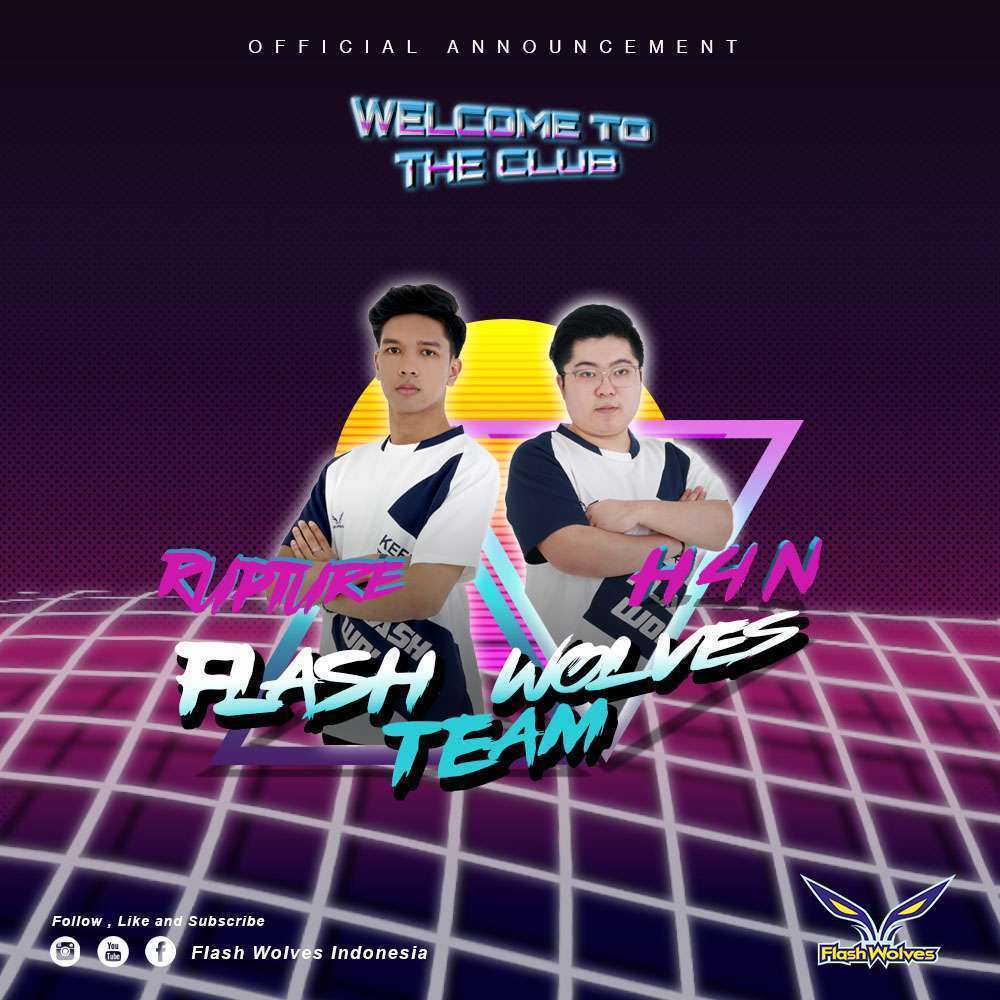 Dua pemain tersebut adalah Yohan “H 4 N” Lim & Advent “Rupture” Valma. Kepastian bergabungnya kedua pemain tersebut diumumkan oleh Flash Wolves Indonesia melalui akun resmi social media mereka.