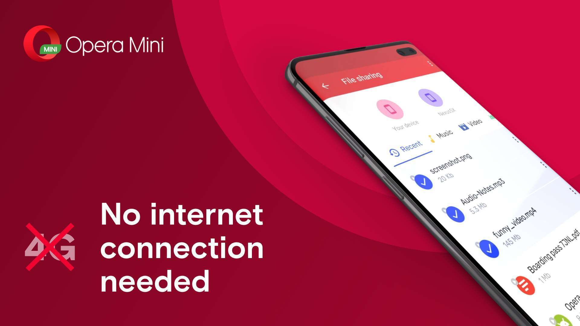 Opera Mini menjadi peramban populer pertama yang menghadirkan solusi berbagi file (file sharing) tanpa harus terhubung ke Internet (offline). Ratusan juta pengguna Opera kini dapat mengirimkan berbagai file, seperti, gambar, video, maupun audio dari satu perangkat ke perangkat lain, yang berdekatan, dengan kecepatan tinggi, tanpa dibatasi oleh jaringan lambat dan tanpa perlu menggunakan data seluler. Dengan fitur file sharing offline baru, cepat, dan aman, pengguna Opera tidak perlu mengunduh aplikasi khusus untuk berbagi file.