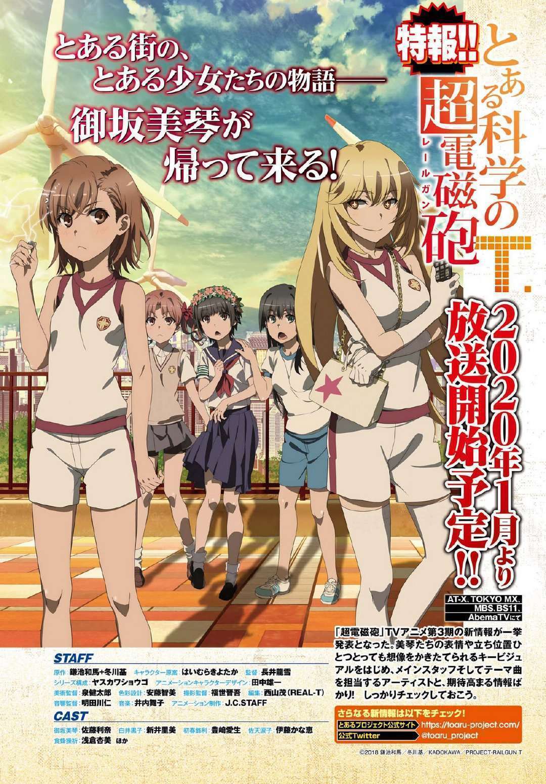 Toaru Kagaku no Railgun, sebagaimana telah diberitakan sebelumnya, season ketiga dari adaptasi anime serial ini akan segera dirilis. Kini sebagaimana dilansir dari Anime News Network, season ketiga dari anime ini akan dirilis di Jepang pada bulan Januari 2020 mendatang. Hal ini terungkap melalui informasi yang termuat dalam majalah Monthly Comic Dengeki Daioh edisi terbaru. fripSide akan kembali menyanyikan lagu pembukanya, sementara itu lagu penutup akan dinyanyikan oleh Kishida Kyodan & The Akeboshi Rockets.